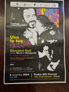 Il Presidente Francesco Gervasio ci informa che lunedì 4 novembre al teatro Elfo – Puccini l’Associazione Alda Merini propone lo spettacolo “USA LA TUA PAZZIA” in memoria della grande poetessa milanese. Canta Giovanni Nuti (si veda la locandina). La manifestazione si avvale anche della sponsorizzazione del Circolo Navigli, Artisti e Patriottica con cento posti disponibili e riservati in buona posizione. Essendo obbligatoria la prenotazione, chi volesse partecipare è pregato di darne conferma al 3287194921 indicando il numero di biglietti richiesti. I biglietti invito verranno consegnati all’ingresso del teatro a partire dalle ore 20.00 oppure al Circolo con qualche giorno di anticipo (feste permettendo).