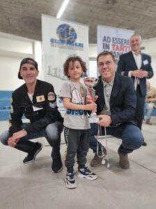 Parliamo di futuro e di un piccolo scacchista che non possiamo ancora tesserare perché la Federazione accetta giocatori solo dal compimento del sesto anno di età. Giona Tesauro Campini non può ancora partecipare alle competizioni istituzionali (Campionati Provinciali e Regionali) e può prendere parte alla MCCL solo grazie ad una deroga inserita nel regolamento che ammette i bimbi non tesserati perché troppo giovani. E, allora, in attesa di raggiungere i fatidici sei anni per poter entrare ufficialmente nel mondo degli scacchi, Giona si prende la soddisfazione di andare a Pieve Emanuele per partecipare ad un torneo amatoriale di beneficenza (Open B) con giocatori adulti e si porta a casa la coppa di secondo classificato. E, per entrare tutti nella fotografia, Arbitri ed Organizzatori devono assumere una postura calcistica…bravissimo, Giona!