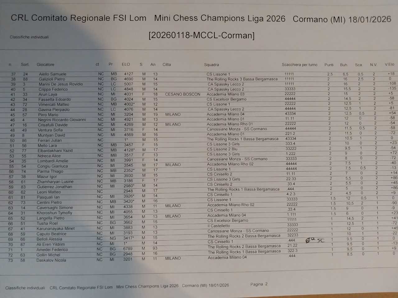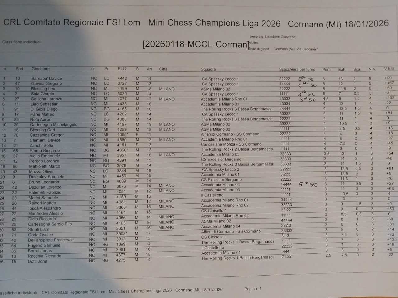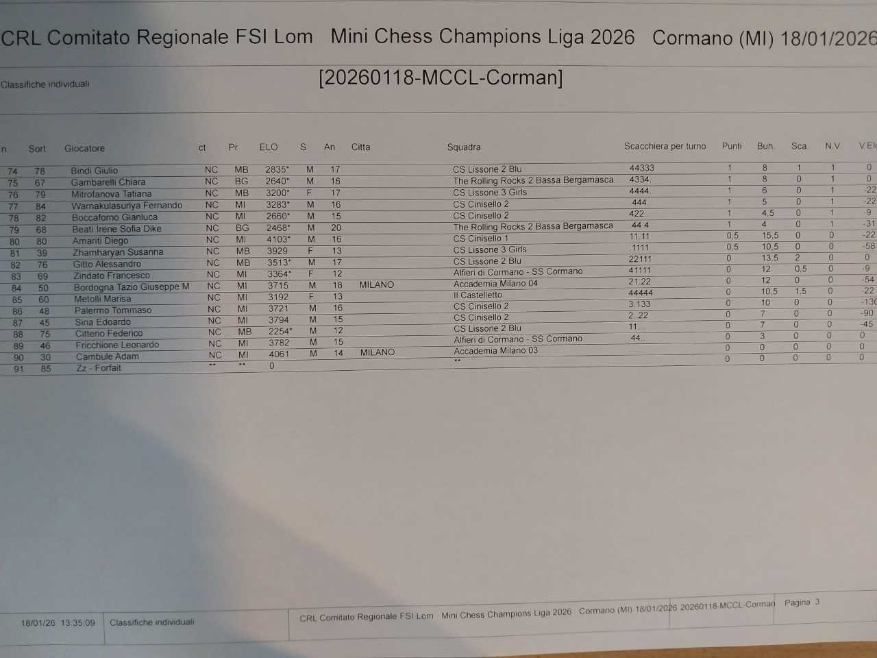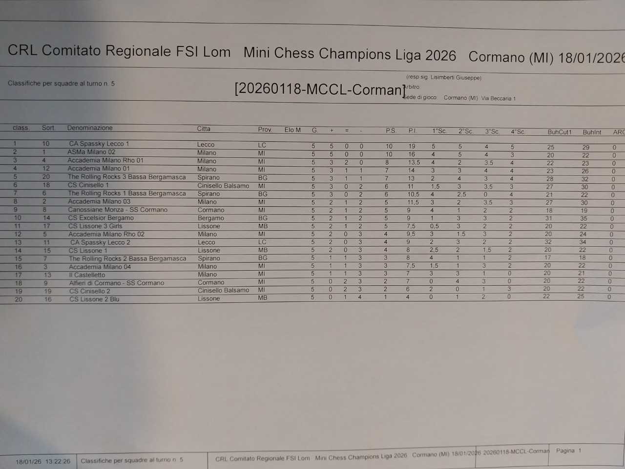 Riparte la Mini Champions Chess Liga e la prima tappa del 2026 vede una splendida edizione a Cormano, domenica 18 gennaio, forte di novanta (90) partecipanti, venti (20) squadre e otto (8) Associazioni scacchistiche (AD Scacchi Boris Spassy Lecco, Accademia Scacchi Milano asd, AD Scacchistica Bassa Bergamasca, ASD Circolo Scacchistico Excelsior, ASD Il Castelletto, ASD Accademia Scacchi Lissone, ASD Scacchi Cinisello, ASD Scuola Scacchi Cormano). Vince la squadra Spassky Lecco 1 (Giorgio Sala, Davide Barnabà, Matteo Pane e Gregorio Gavina) a pari merito con la squadra Accademia 02 (Carl Blessing, Leo Blessing, Michelangelo Cartesegna e Sergio Elio Cartesegna) con 10 punti squadra entrambe ma 19 punti individuali per Lecco e 16 per Milano. Al 3° posto è Accademia Milano Rho 01 (Davide Clementi, Davide Crisafulli, Lorenzo Galliena e Matteo Raineri) con 8 punti squadra e 13.5 individuali. La migliore squadra femminile è Canossiane Monza (Sofia Zanchi, Beatrice Caputo, Amelie Lombardi e Sofia Ventura), nona assoluta a 9 punti squadra e 11.5 punti individuali. I capocannonieri: migliore prima scacchiera è Giorgio Sala (5/5), migliore seconda è Davide Barnabà (5/5 e migliore giocatore assoluto del torneo), migliore terza è Lorenzo Galliena (4.5/5), migliore quarta è Gregorio Gavina (5/5), migliore quinta è Lorenzo Dezulian (Accademia Scacchi Milano, 3/5) e migliore sesta è Ali Eren Yldrim (Cinisello, 1/5). Un plauso alla nostra piccola Accademia 02 composta da tre giocatori under 8 (6 anni) ed da un giocatore under 10 che ha intenerito tutti per le dimensioni ridotte dei giocatori ma ha impressionato per la determinazione sulle scacchiere. Pensate che a Leo Blessing non è bastato vincere tutte le partite (5/5) per ottenere il riconoscimento di migliore seconda scacchiera, superato per un solo punto e mezzo di Bukkolz dal 1° giocatore assoluto del torneo. Ricapitolando: livello assai alto di gioco, entusiasmo, correttezza, voglia di partecipare e movimento under 14 lombardo quanto mai vivace e in fase di espansione. Si ringrazia l’organizzazione nelle persone dei disponibili ed attivissimi Filippo Niccolò (Presidente ASD Scuola Scacchi Cormano) e Giuseppe Lisimberti (senza bisogno di alcuna presentazione). Si attendono candidature per il mese di febbraio. Pubblichiamo in allegato le classifiche (a Squadre e Individuali) del Torneo.