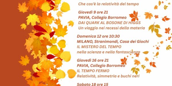 Siamo felicissimi di divulgare la locandina con gli incontri a cura di Giorgio Chinnici per il mese di ottobre. Si parte venerdì a Novara parlando di relatività del tempo e si conclude giovedì 23 a Pavia dissertando sulla struttura dell’Universo….